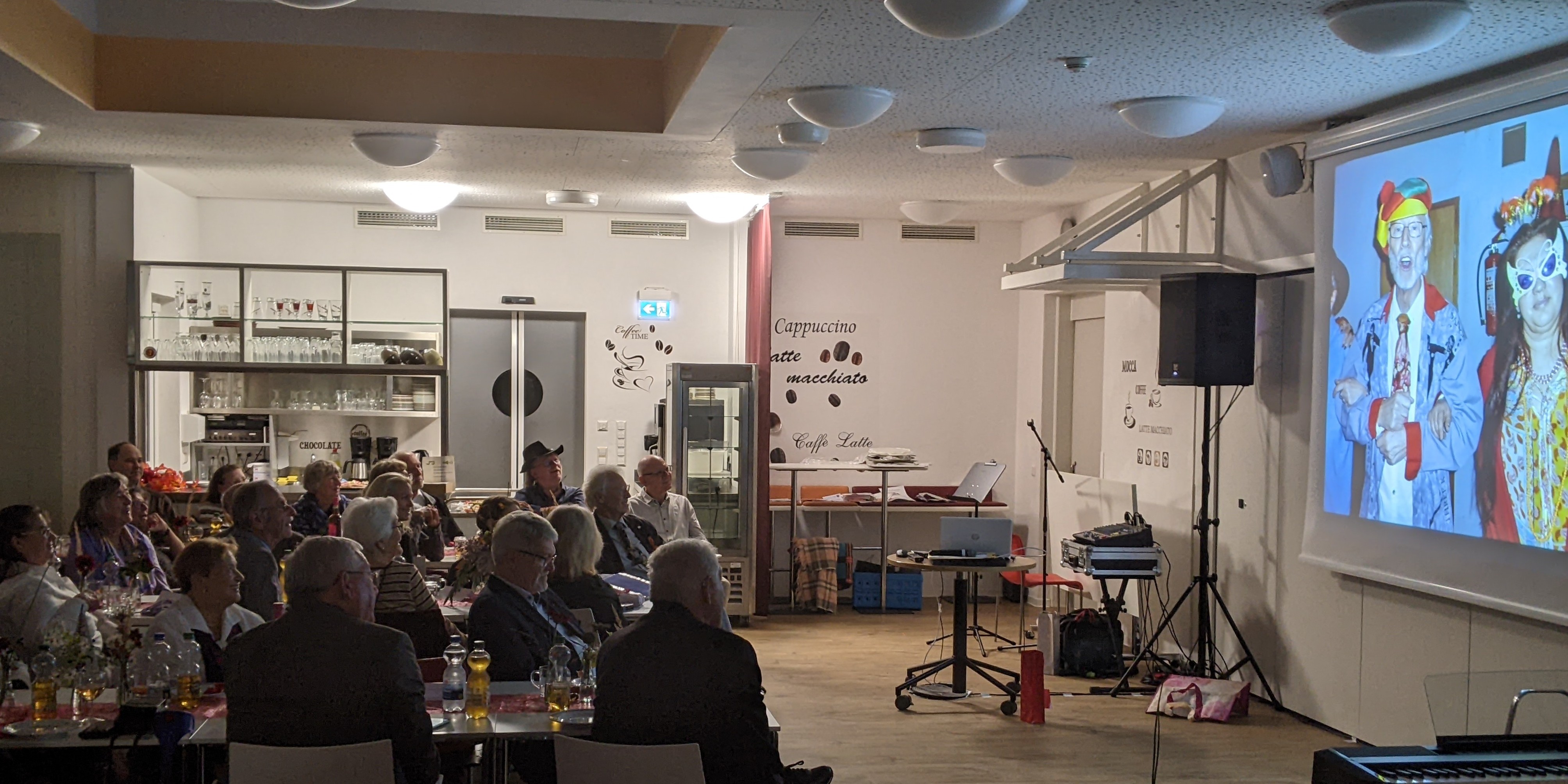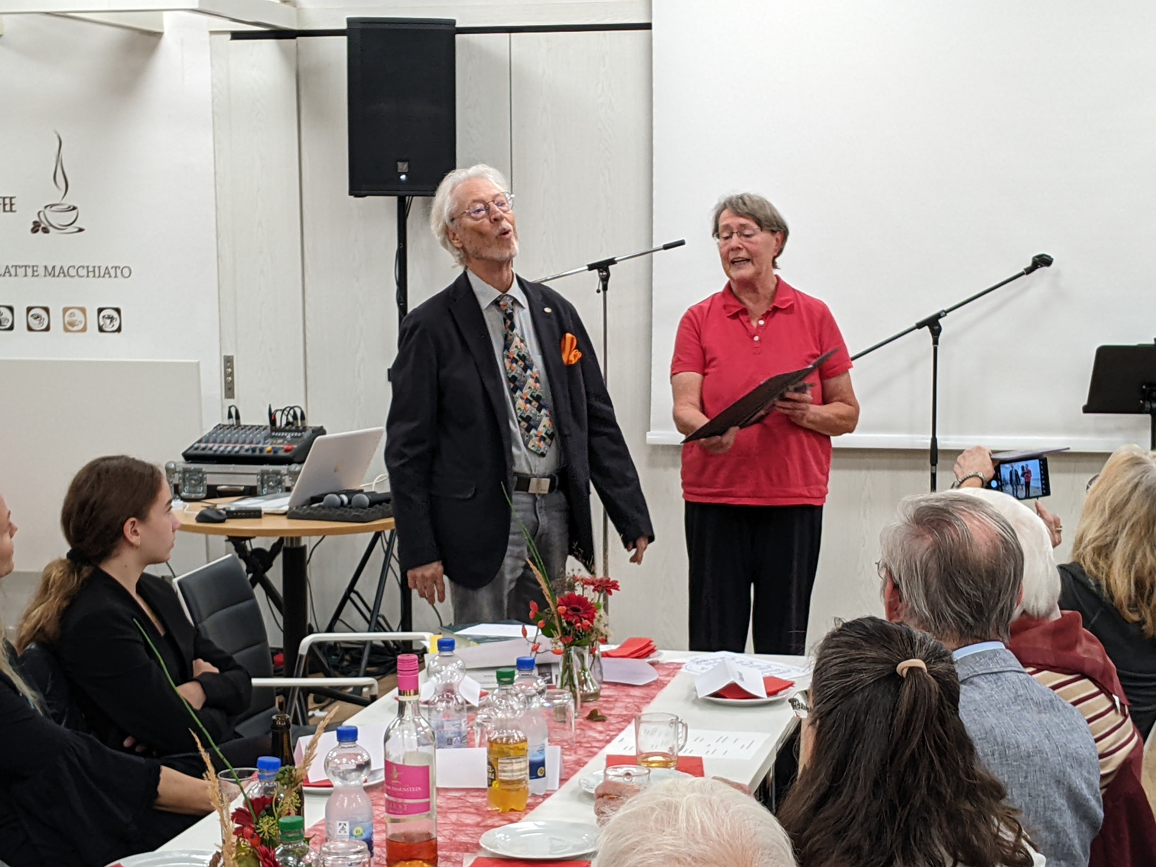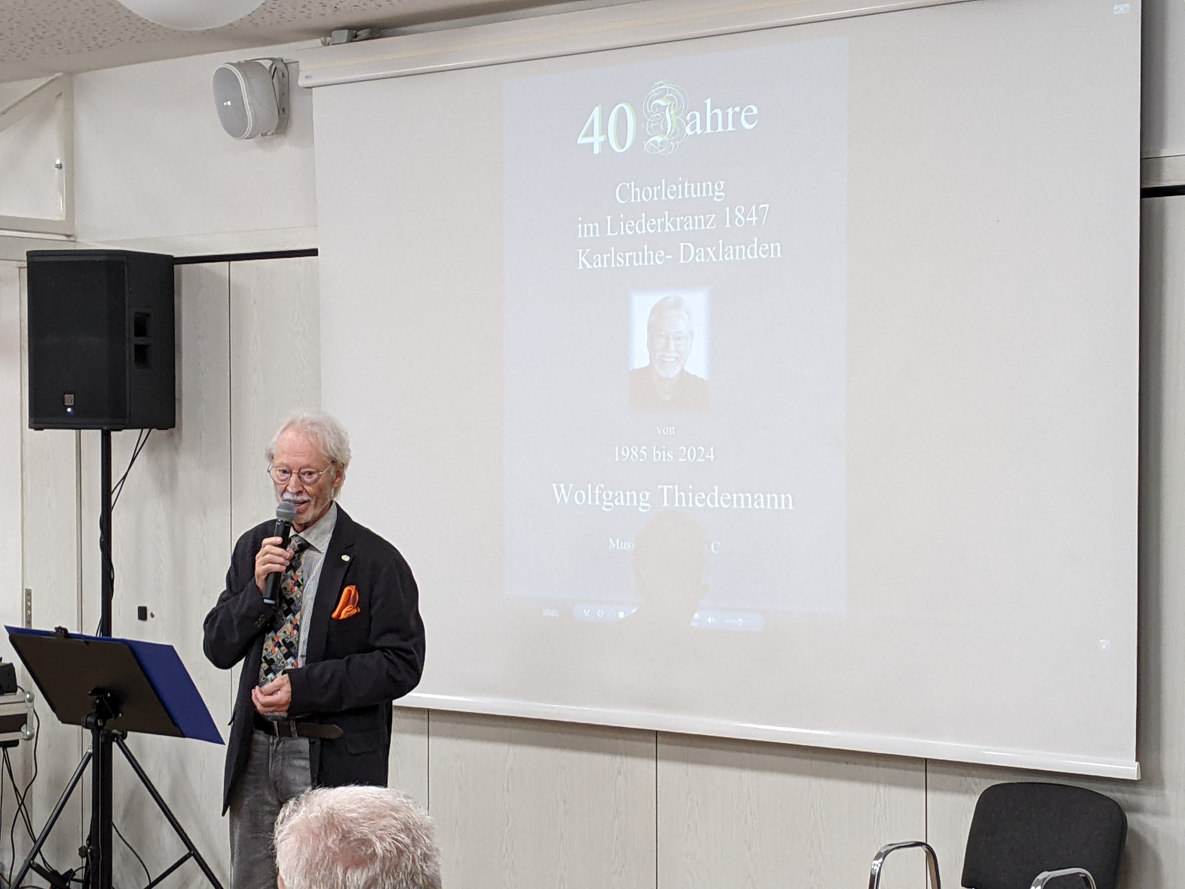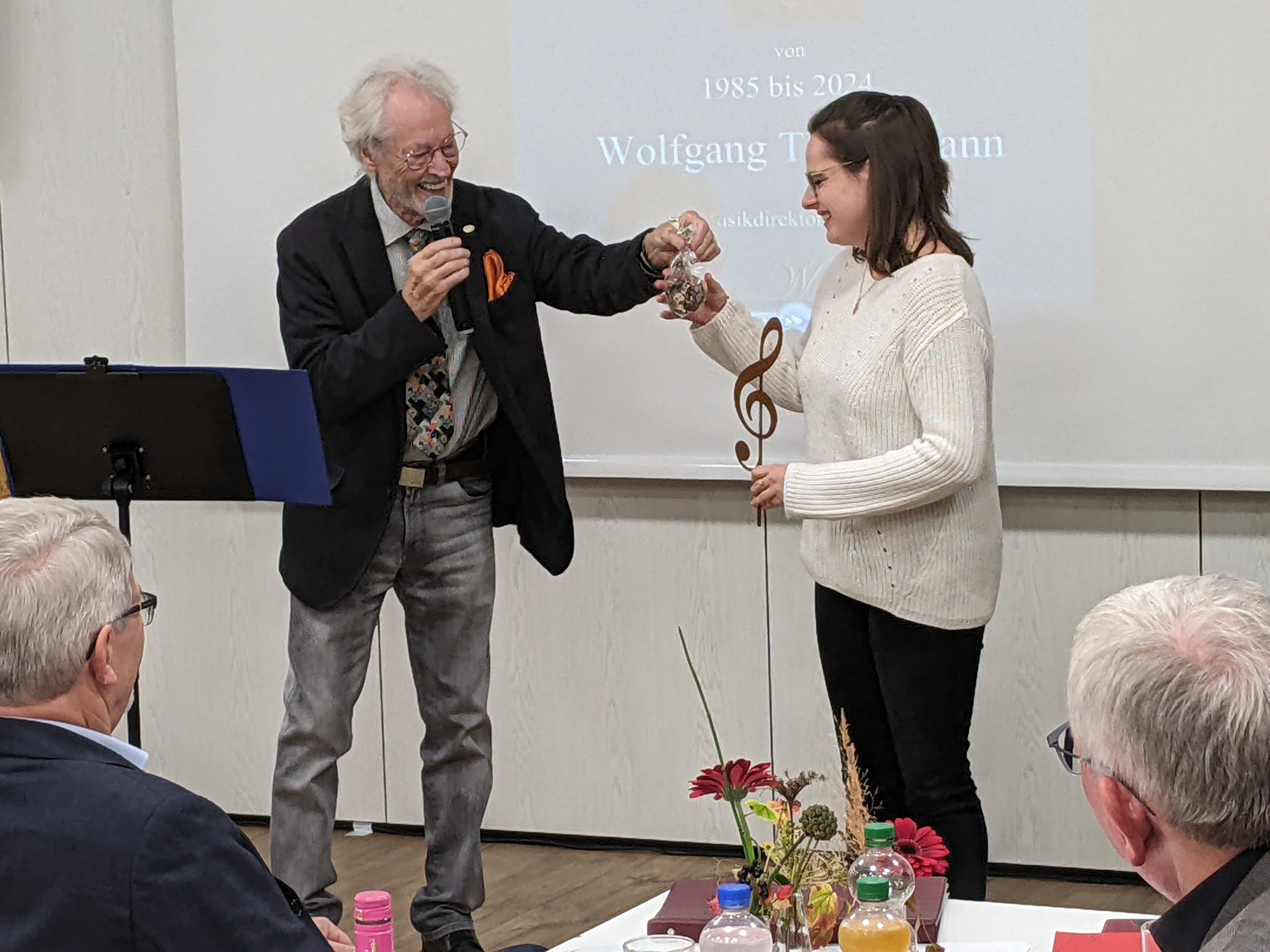 Nach einer kurzen Pause ging Wolfgang Thiedemann in seiner Ansprache auf seine lange Tätigkeit beim Liederkranz Daxlanden ein. Er übergab seiner Nachfolgerin Sabrina Cepreaga einen Notenschlüssel und erzählte einige lustige Anekdoten, bevor er einen Film vorführte, der viele schöne Erinnerungen an diversen Auftritten des Liederkranz wachrief.