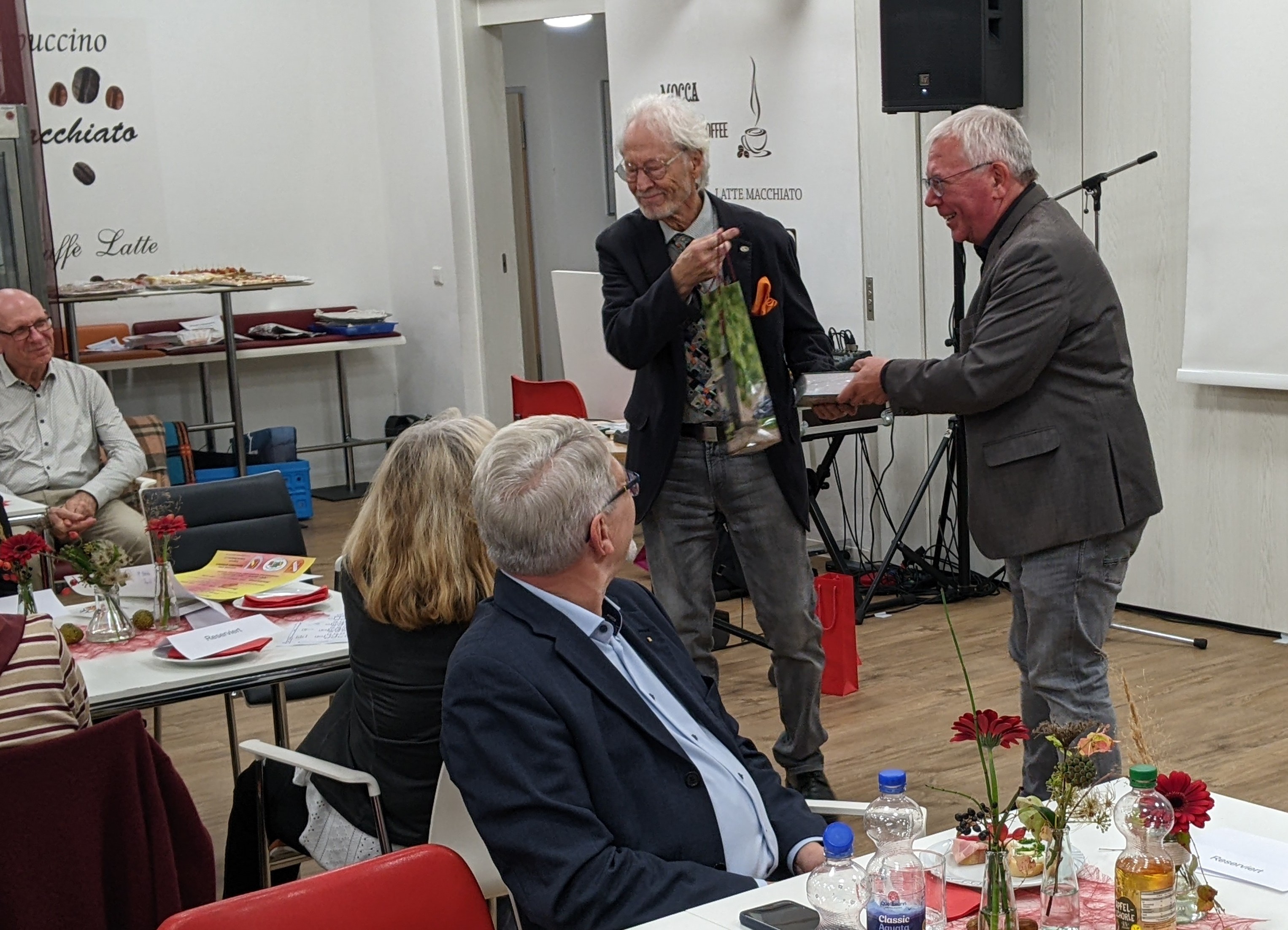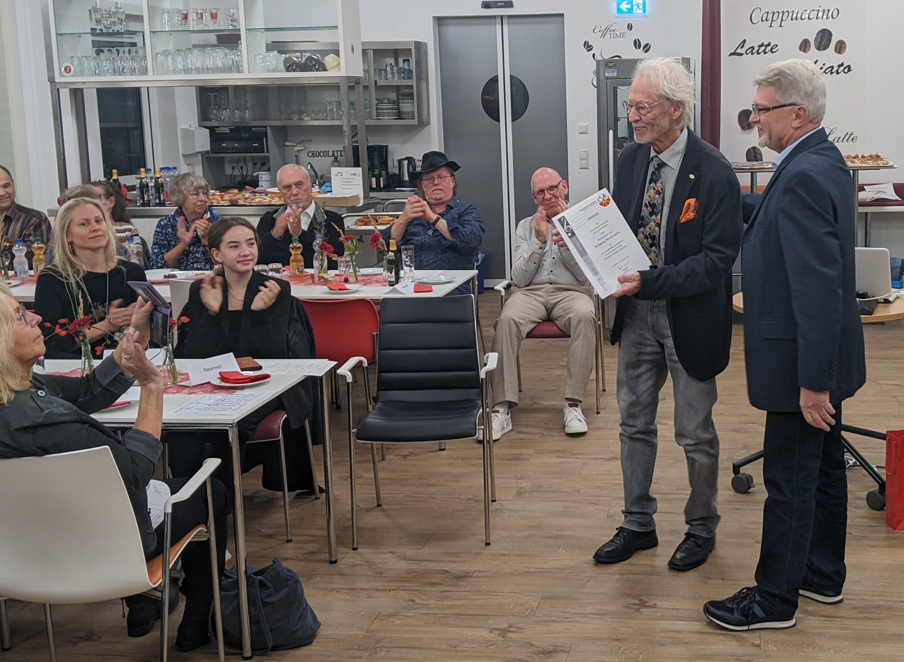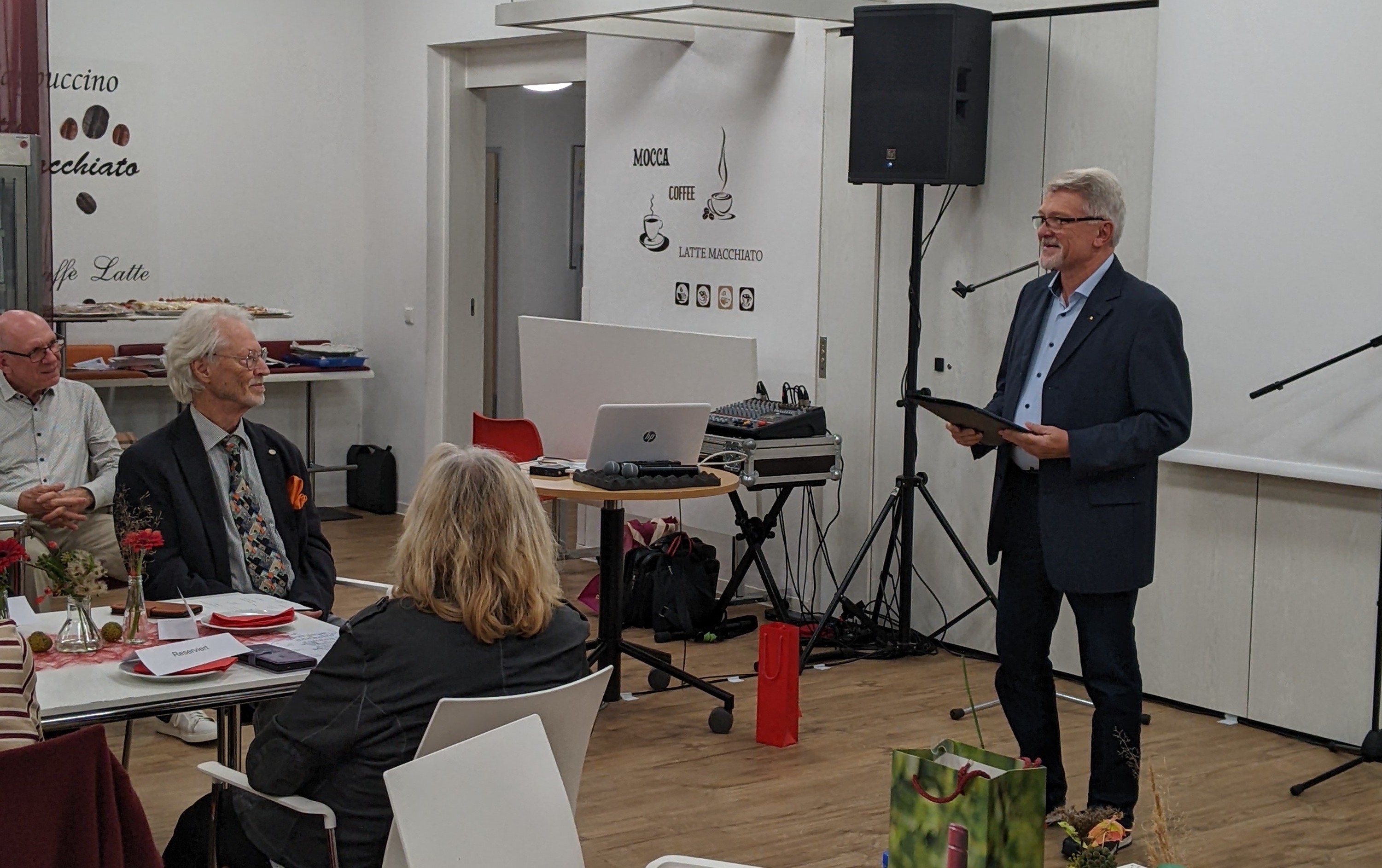 Unser Dirigent Wolfgang Thiedemann hat nach fast 40-jähriger Tätigkeit als Dirigent beim Liederkranz Daxlanden seinen Dirigentenstab niedergelegt. Aus diesem Grund hatte der Liederkranz Daxlanden seine Mitglieder, Freunde und Gönner eingeladen, um sich am 19.10.2024 bei einer feierlichen Veranstaltung von seinem Dirigenten Wolfgang Thiedemann zu verabschieden. Susanne Schulte vom Vorstandsteam des Liederkranz Daxlanden begrüßte die Anwesenden und führte durch das Programm. Nach einem Liedvortrag „Sag beim Abschied leise servus“ durch das Frauenquartett - Gudrun Schuster, Gudrun Heider, Monika Jüngert und Birgitta Maier – und einer Ansprache von Susanne Schulte, die unter anderem die lange Tätigkeit von Wolfgang Thiedemann hervorhob und diesem eine Urkunde mit der Ernennung zum Ehrenchorleiter des Liederkranz Daxlanden übergab, überbrachten der Präsident des Badischen Chorverbands Hort Winter, Raimund Horzel als Ehrenvorstand des Bürgervereins und Horst Kappler als Vorstand des Bürgervereins ihre Grußworte. Knut Maurer, ein langjähriger Weggefährte von Wolfgang Thiedemann, überbrachte musikalische Grüße auf dem E-Piano. Der Gemischte Chor des Liederkranz Daxlanden brachte unter der neuen Dirigentin Sabrina Cepreaga das Lied „Zeit ist ein Geschenk“ zum Vortrag. Vom Chor erhielt Wolfgang als Erinnerungsgeschenk eine Uhr, die nicht nur Datum und Zeit, sondern auch Pulsschlag, Blutdruck und vieles mehr anzeigt. Frau Thiedemann, die vieles für unseren Chor getan hat, nur um ein Beispiel zu nennen, die Übersetzung ausländischer Lieder ins Deutsche, die Wolfgang teilweise für den Liederkranz arrangiert hat, erhielt für ihr Engagement für den Liederkranz Daxlanden einen Blumenstrauß.